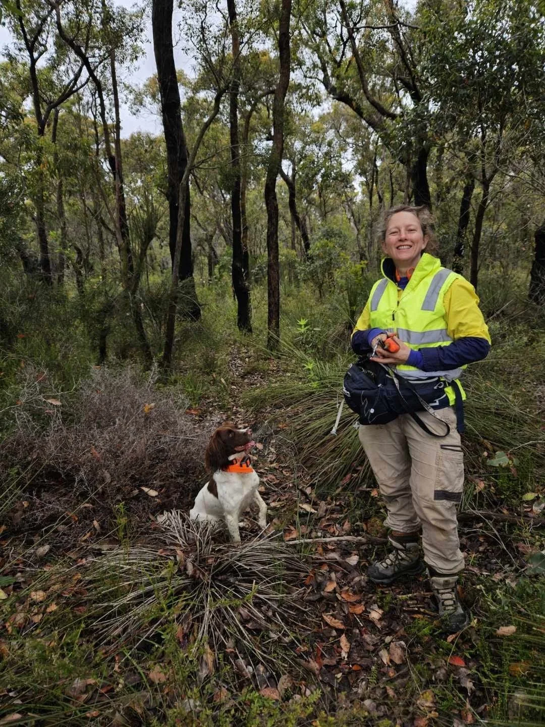 Kelly is an English Springer Spaniel who joined us as part of a Commonwealth project to deliver Phytopthora detection dogs nationally from Tate Animals. Trained from 8 weeks of age on Phytopthora, Kelly thinks it is the best thing in the world! Kelly is handled by founder Megan and handler Kelby. She is intense, resilient and incredibly adaptable, thriving in low and high odour tasks. From clearing areas to screening vehicles, checking soil, clearing breaches, and mapping edges, Kelly is here to help defend our native flora in any way she can.